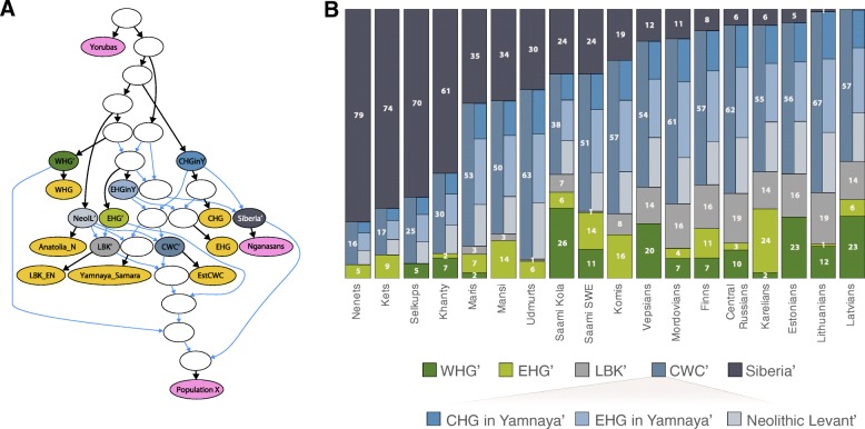Fig. 6 Proportions of ancestral components in studied European and Siberian populations and the tested qpGraph model. a The qpGraph model fitting the data for the tested populations. Colour codes for the terminal nodes: pink—modern populations (‘Population X’ refers to test population) and yellow—ancient populations (aDNA samples and their pools). Nodes coloured other than pink or yellow are hypothetical intermediate populations. We putatively named nodes which we used as admixture sources using the main recipient among known populations. The colours of intermediate nodes on the qpGraph model match those on the admixture proportions panel. b Admixture proportions (%) of ancestral components. We calculated the admixture proportions summing up the relative shares of a set of intermediate populations to explain the full spectrum of admixture components in the test population. We further did the same for the intermediate node CWC’ and present the proportions of the mixing three components in the stacked column bar of CWC’. Colour codes for ancestral components are as follows: dark green—Western hunter gatherer (WHG’); light green—Eastern hunter gatherer (EHG’); grey—European early farmer (LBK’); dark blue—carriers of Corded Ware culture (CWC’); and dark grey—Siberian. CWC’ consists of three sub-components: blue—Caucasian hunter-gatherer in Yamnaya (CHGinY’); light blue—Eastern hunter-gatherer in Yamnaya (EHGinY’); and light grey—Neolithic Levant (NeolL’). Сitation from: Kristiina Tambets et al. Genome Biology (2018), Genes reveal traces of common recent demographic history for most of the Uralic speaking populations